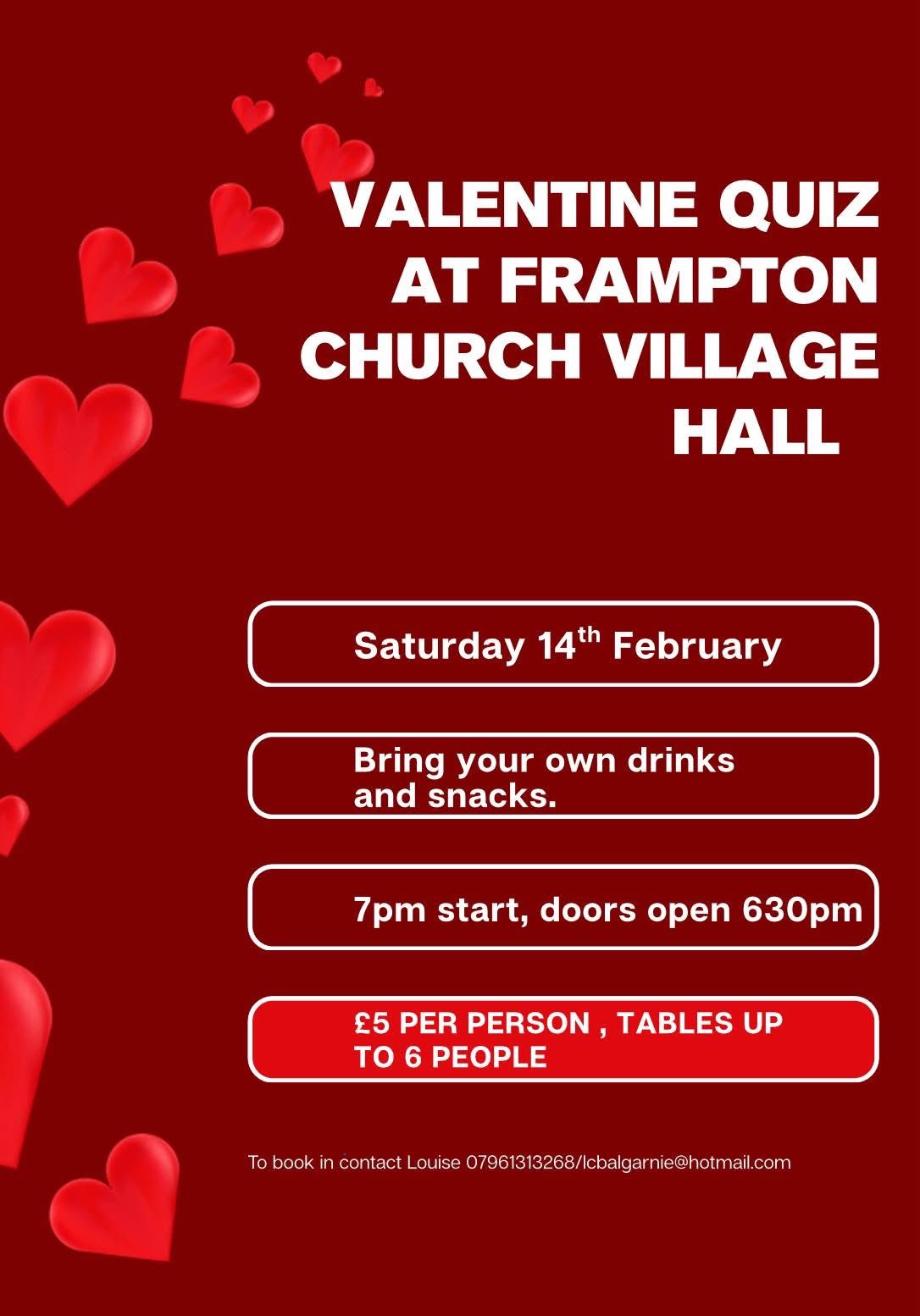 Raising money for Frampton WI and Frampton Village Hall. £5 per person, teams of up to 6. Take your own drinks and snacks. To book in contact Louise on 07961313268When: Saturday 14th February 6:30pm - 10:00pm
