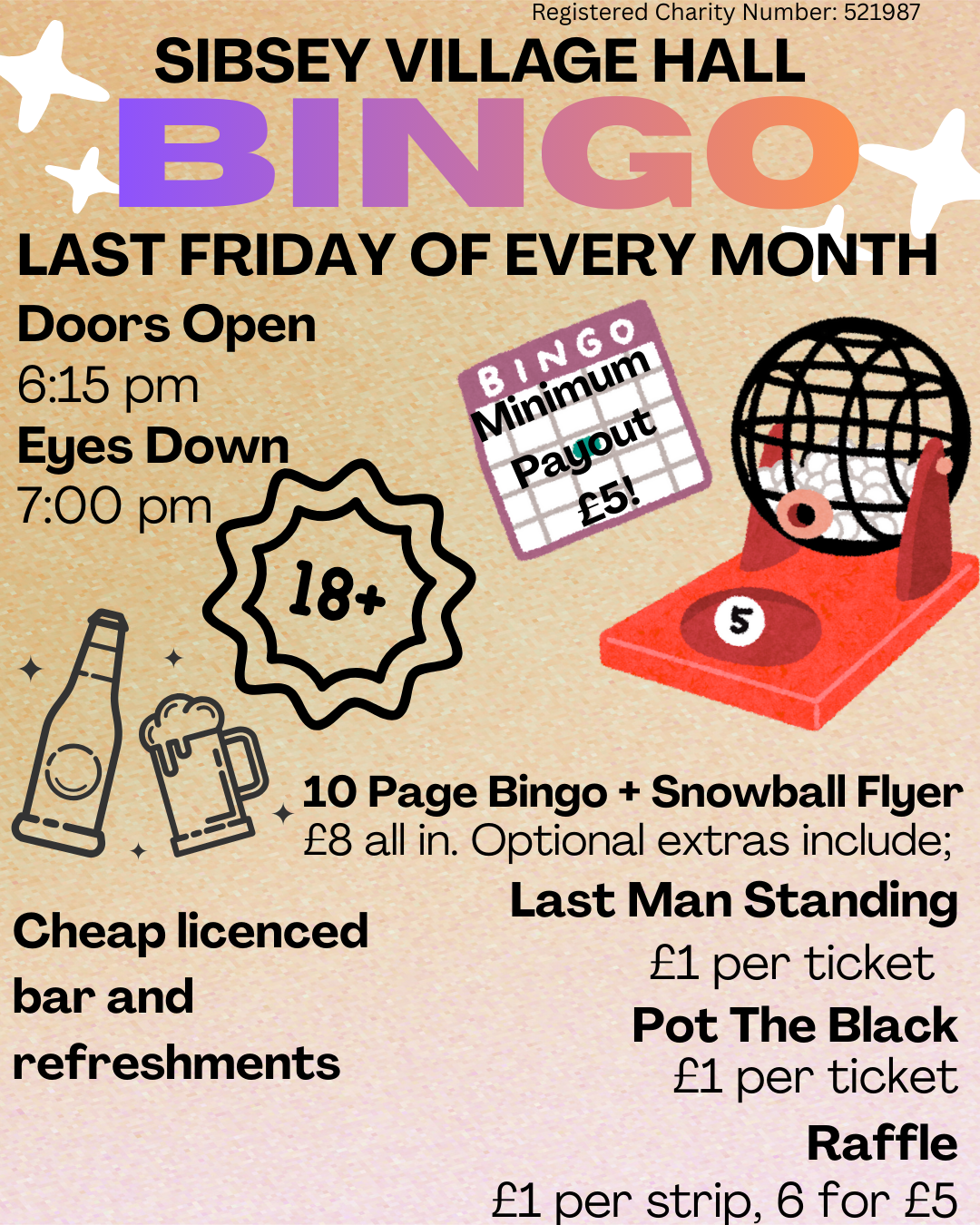 £8 Bingo and Snowball Flyer (Snowball worth £250 in January!). Optional Last Man Standing for £1 a ticket. Cheap Bar selling alcoholic, soft and hot drinks plus Raffle. Over 18s only.