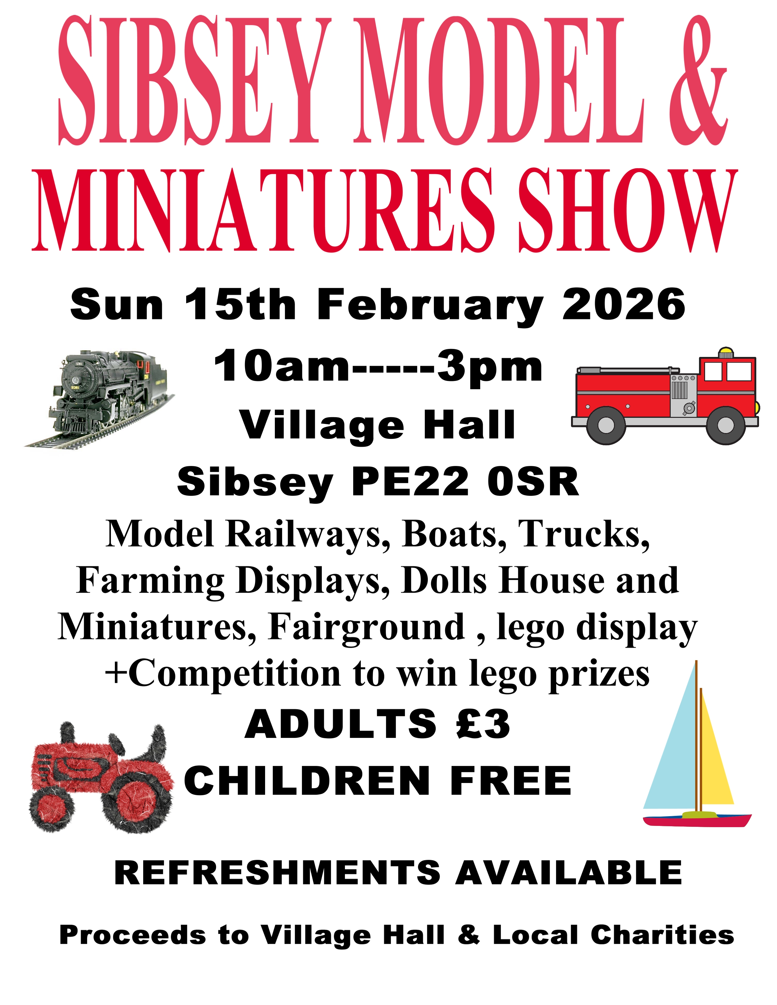 Model Railways, Boats, Trucks, Farming Displays, Dolls House and Miniatures, Fairground, Lego Displays and competitions to win Lego prizes. Refreshments available. Adults £3, children free - all proceeds to the village hall and local charities.When: Sunday 15th February 10:00am - 3:00pm