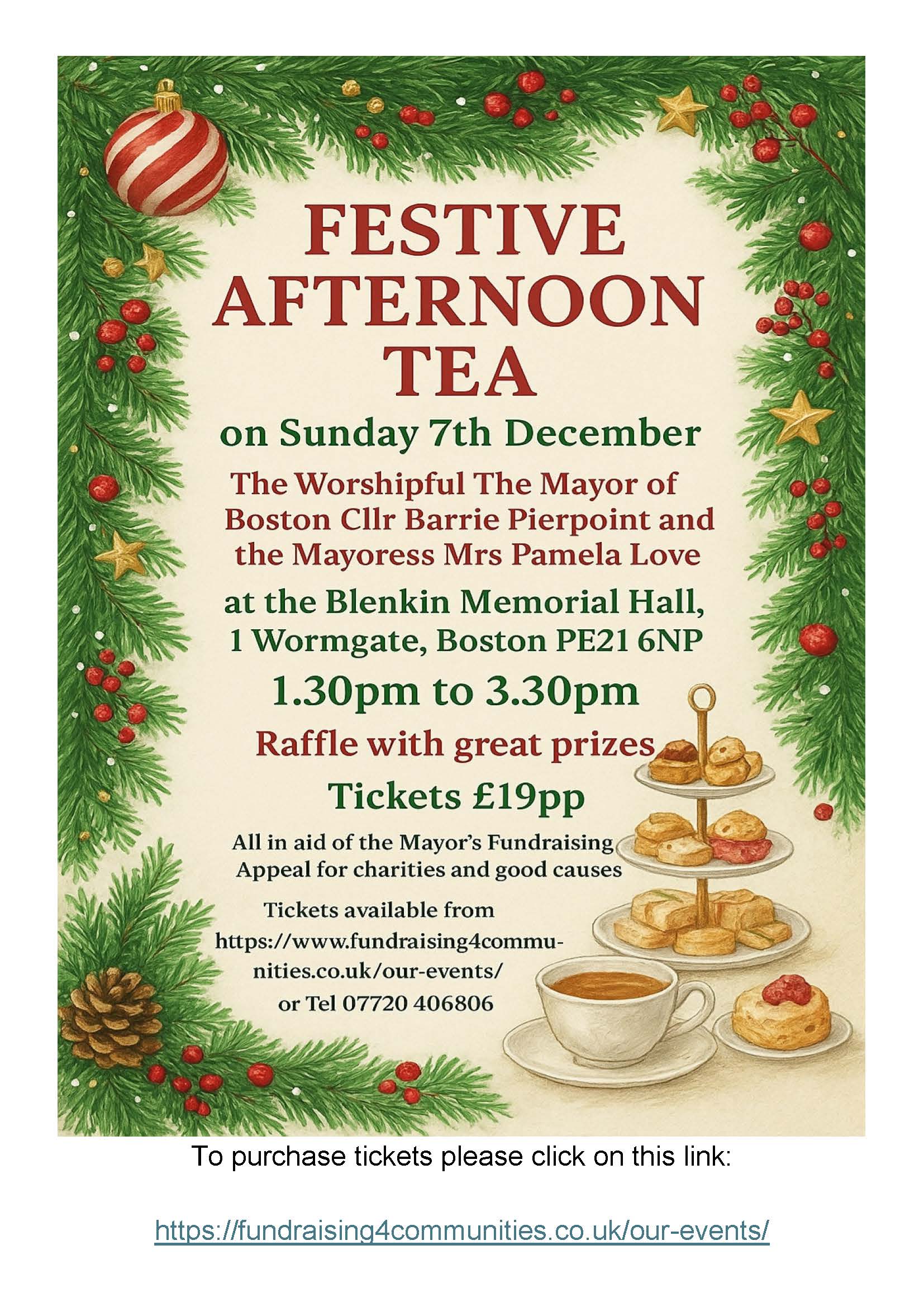A festive adternoon tea in aid of the Mayors Charities and good causes. There will be a raffle with some great prizes.