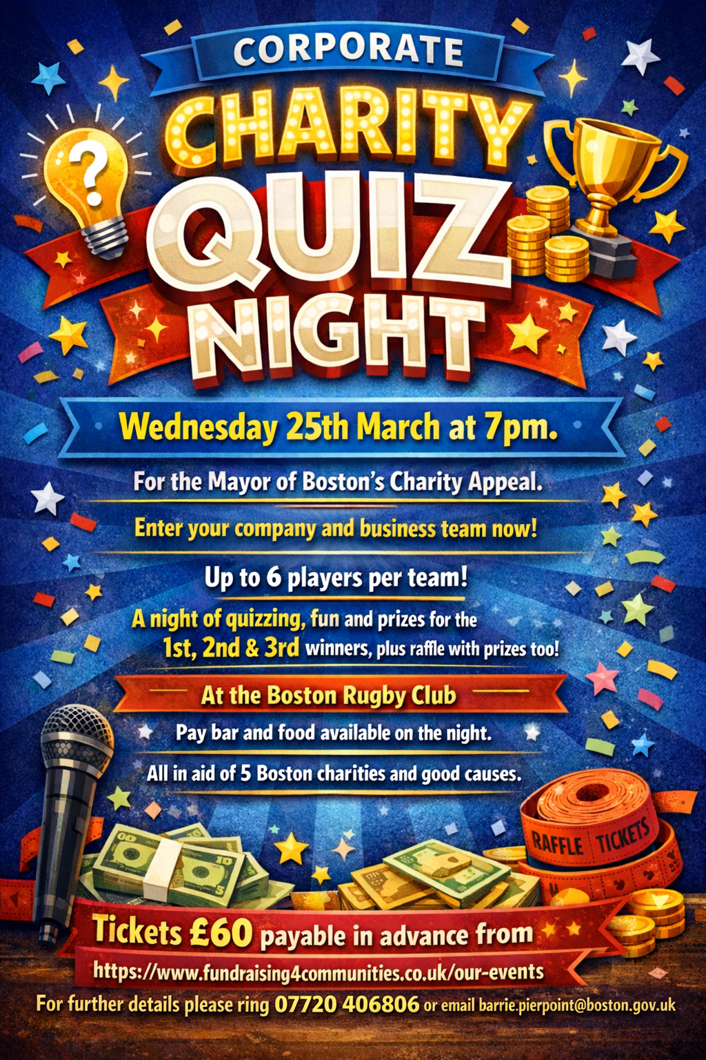 Tickets £60 per team payable in advance from fundraising4communities.co.uk/our-events or email barrie.pierpoint@boston.gov.uk